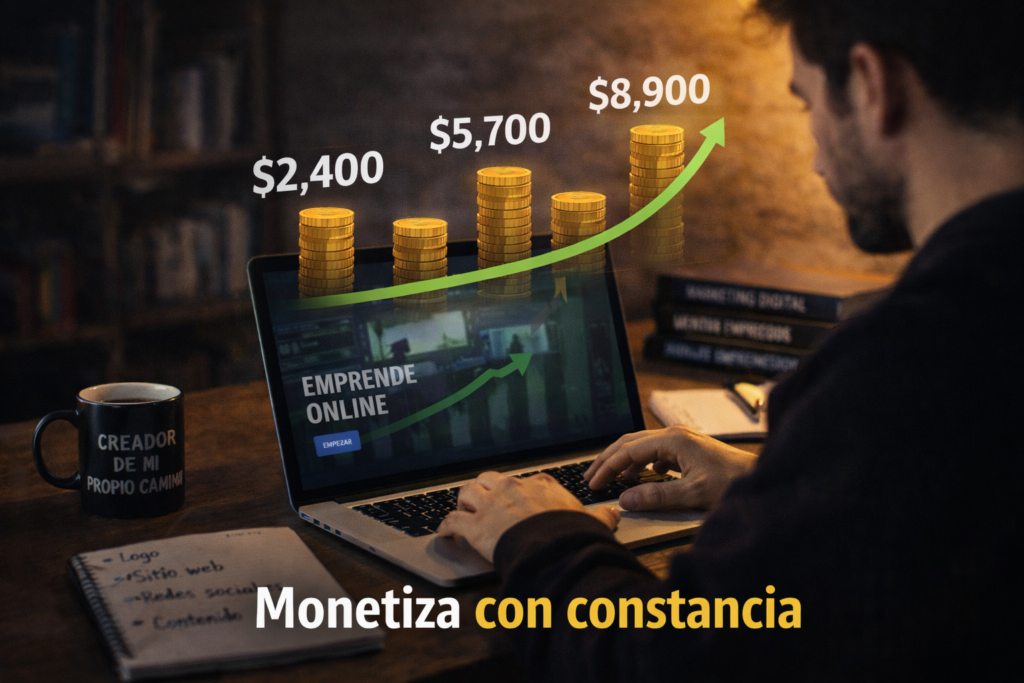 Puede ser vender productos digitales, ofrecer servicios online, crear contenido que monetizas con publicidad o afiliados, o promocionar productos de otras personas y ganar una comisión por cada venta.